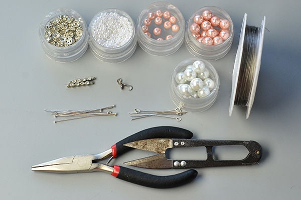 Группируя жемчужные бусины на штифтах, будьте осторожны, чтобы не повредить руки плоскогубцами и острыми кончиками булавок.