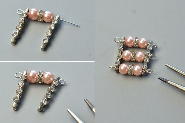 получившиеся подвески прикрепите к петлям в заготовке с разделителями со стразами и розовыми бусинками.