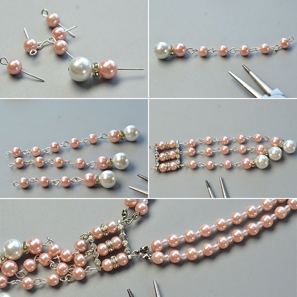 соедините каждый из получившихся фрагментов цепочек из розовых бусин с заготовками на пинах с белыми жемчужинами (как показано на рисунке);