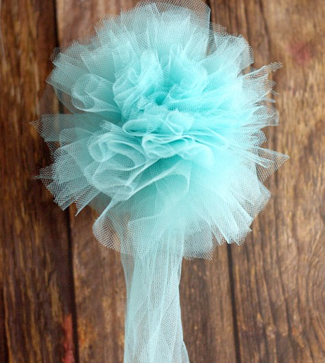 Если фатин намотать на более крупную форму. Не разрезать его. Просто перевязать посередине и красиво расправить. Добавить декора, то получиться шикарное свадебное украшение, которое используется в декоре зала, арок или автомобиля.