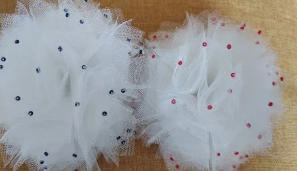 7. Если заметны неровности, их можно аккуратно подрезать при помощи ножниц. Это и вся премудрость, которая подскажет как сделать бантик из фатина. Проявите небного фантазии, чтобы сделать украшение более праздничным. Это могут быть бусины, стразы, пайетки. Яркий блеск делает бант более праздничным. По такой же технологии женщины делают красивые украшения для своих дочерей.