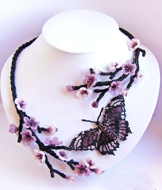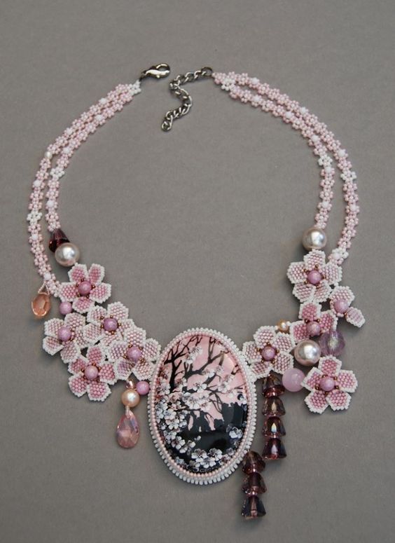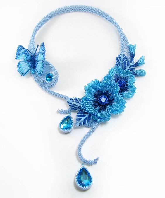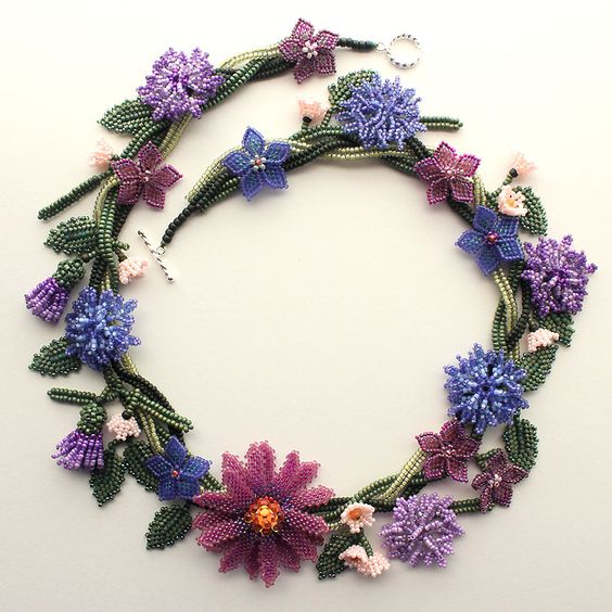 Другим потрясающим вариантом использования цветочных композиций из бисера (только посмотрите на фото!) являются роскошные ожерелья, сравнимые порой с истинными произведениями искусства.