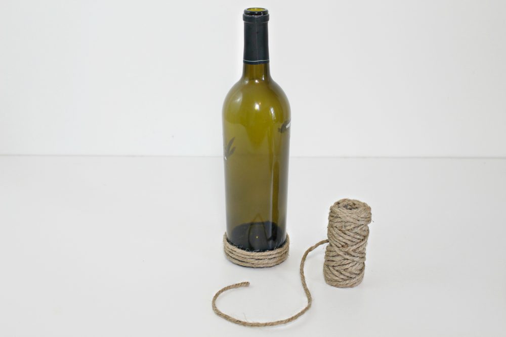 Шаг 1. Протрите стеклянную поверхность спиртом или любым другим растворителем. С помощью клеевого пистолета нанесите клей на нижнюю часть бутылки – примерно 2,5 см в высоту и сделайте 4 витка толстым шпагатом вокруг бутылки.