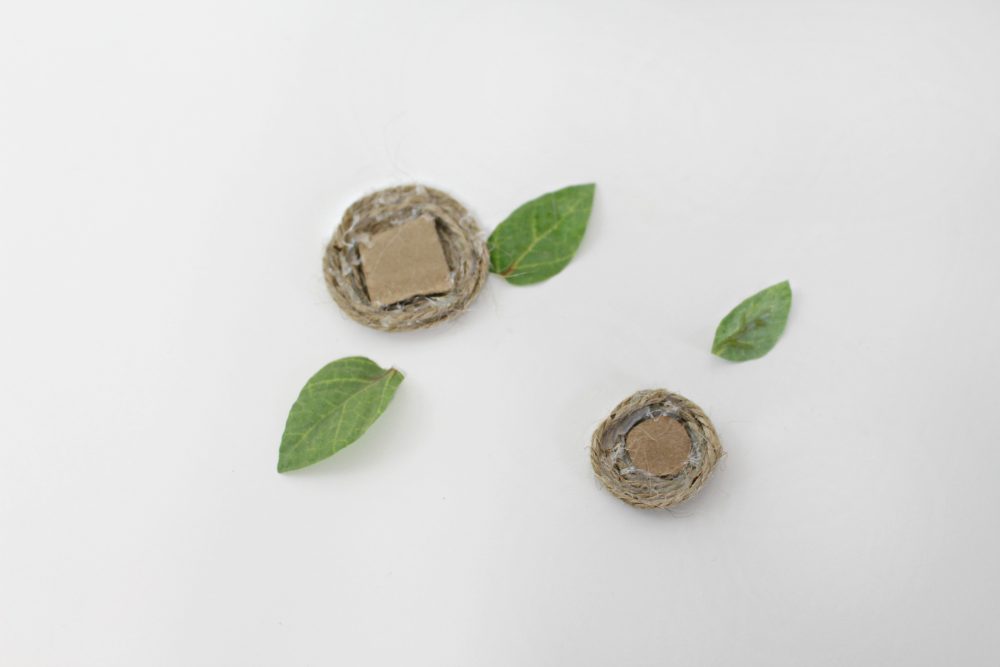Шаг 9. Сделайте два «цветка» из шпагата. Мы использовали маленькие кусочки картона, чтобы сделать центр каждого «цветка» (см. Фото). Более крупный цветок имеет диаметр 5 см, а меньший – 2,5 см.