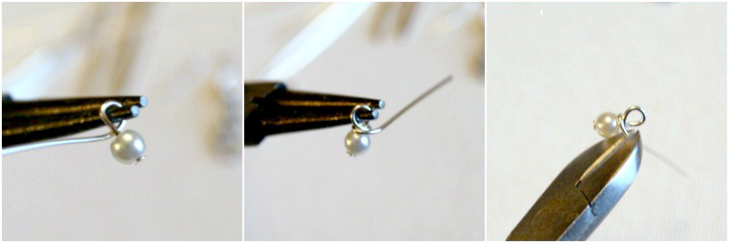 Делаем из бусин подвески. Для этого нужно просто одеть бусину на пин и, используя круглогубцы, загнуть штифт над плоскогубцами в петлю, обернуть его вокруг «шейки» петли, которую вы только что создали, и отрезать лишнюю проволоку с помощью кусачек. Процесс показан на фото ниже: