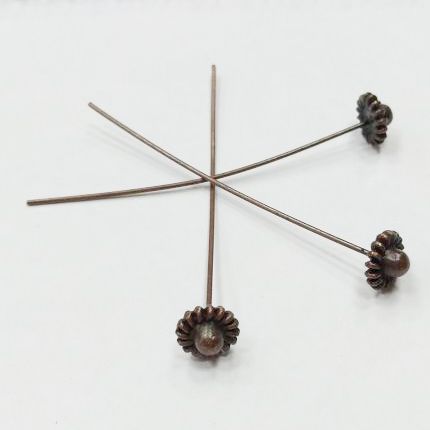 2. Пины, имеющие шляпку, шарик либо иной декоративный элемент на конце – их применяют обычно для изготовления подвесок из бусинок, имеющих сквозное отверстие. Их можно считать более универсальным видом, чем предыдущий, так как их в любой момент можно превратить в пины с ушком, обрезав декоративную шляпку и согнув вместо нее петлю. Только эти пины обычно стоят дороже, нежели пины с ушком, так как изготовление декоративного кончика требует больше усилий. Их применяют для завершающих деталей украшения, когда бусинка либо подвеска прикрепляются к основе лишь одной стороной, на которой выполняется соединительное колечко.