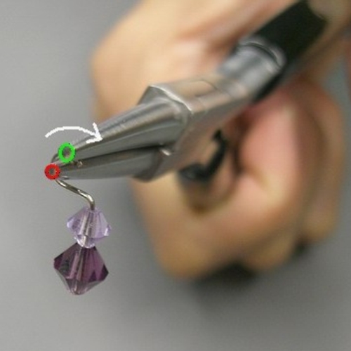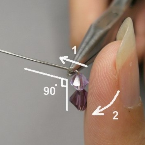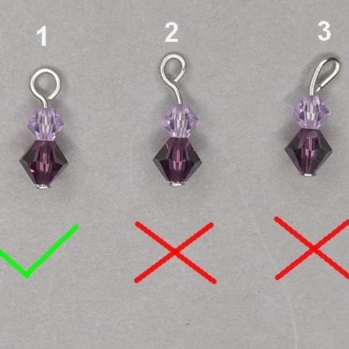 Когда на пин надеты все бусины таким образом, чтобы на конце свободными осталось не меньше 7 мм проволоки (можно больше, только в этом случае колечко выйдет больше стандартного), этот свободный конец загибают на 90о, используя круглогубцы. Затем также круглогубцами захватывают самый кончик пина и поворачивают его по окружности таким образом, чтобы он оказался с обратной стороны от основания и под углом так же в 90о по отношению к основанию. Как результат вы получите правильное колечко, за которое готовую подвеску можно прикрепить к основе изделия. Если кольцо выйдет не очень красивым, поправьте его, используя круглогубцы (см. фото ниже).