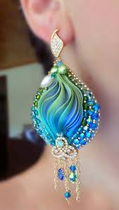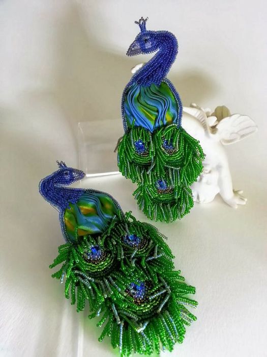 17. Кулоны, сережки или броши в виде сказочных павлинов и других птиц получаются особенно живописными в сочетании с лентами шибори.
