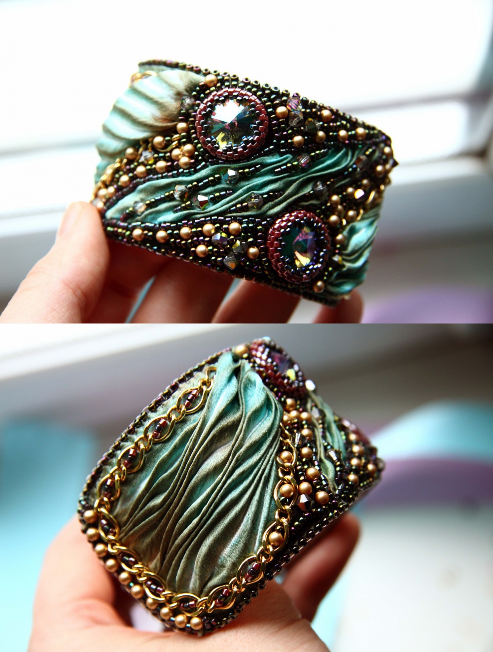 7. Браслеты с тонко подобранными по цветовой гамме элементами, грациозно уложенными тканевыми складками и со вкусом расположенными по рельефной поверхности аксессуара бусинками представляют собой настоящие произведения искусства, на которые можно любоваться часами, путешествуя взглядом по всех этой сложной и утонченной «топографии» геометрического, текстурного и колористического волшебства.