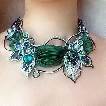 16. В этом колье автор акцентирует извилистые контуры изделия с помощью сутажных шнуров черного и светло-салатового цвета. Такой прием увеличивает объмность композиции, но и добавляет ей легкости и делает более отчетливой.