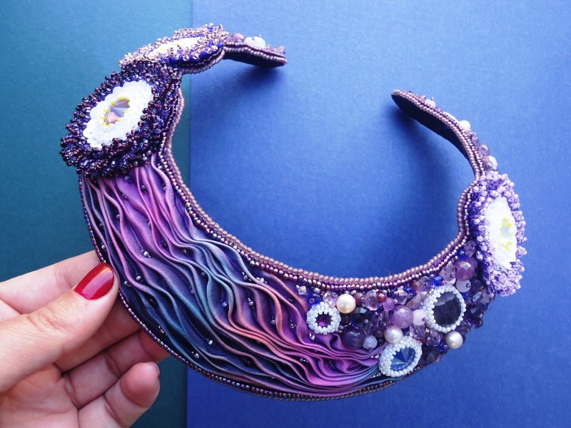 13. В этой модели можно видеть, как автор играет с цветовыми переходами и фигурными волнами на ткани, сместив россыпи камней и бусин на края композиции.