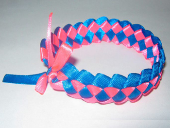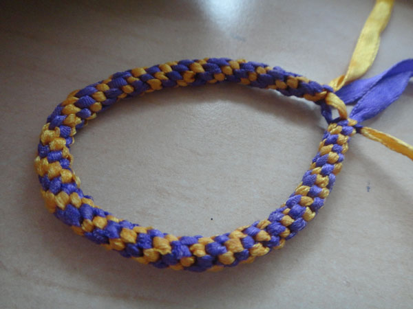 9. Соединение плетения в браслет. Протяните две свои ленты через узелок, где была булавка. Для этого можно использовать большую (цыганскую) иглу. Такое крепление концов лент сделает ваш браслет удобным и легко надеваемым.