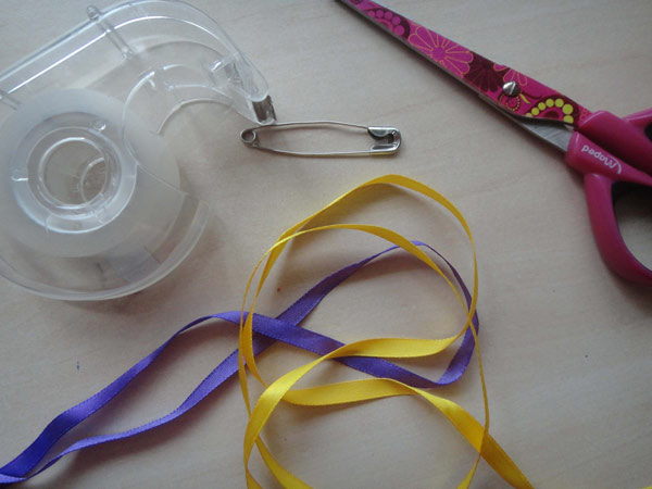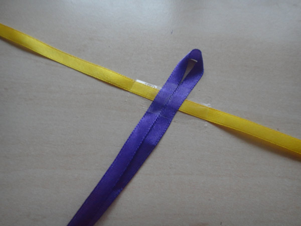 1. Прикрепите ленты к столу или любой другой плоской поверхности, чтобы желтая была под фиолетовой, как показано на фотографии.