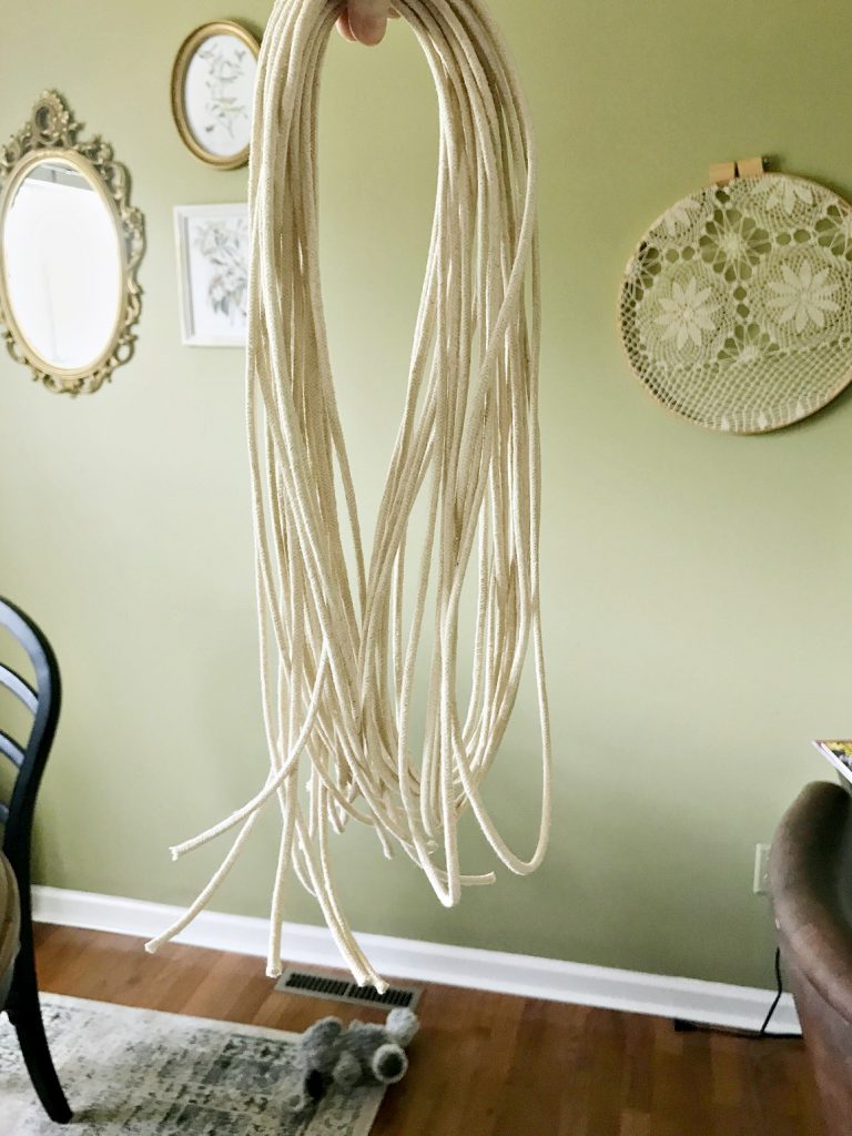 3. Измерьте высоту вашего светильника и разрежьте ваш шнур на отрезки длиной в 9 раз больше, чем высота светильника. Прикрепите получившиеся шнуры к металлическому каркасу.