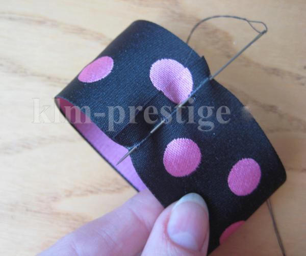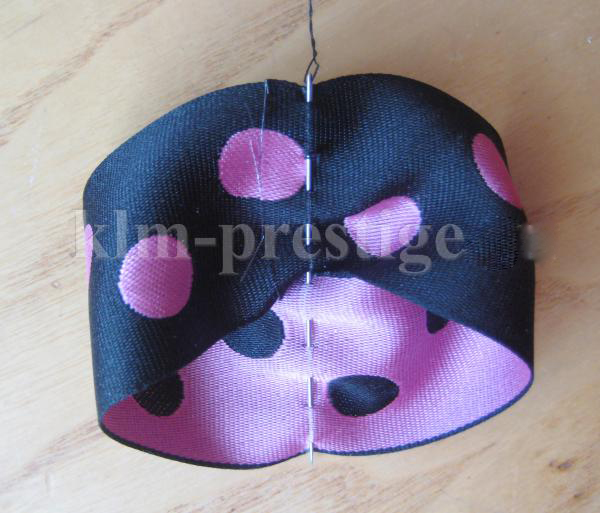 4. Таким же способом и этой же ниткой прошейте вторую ленту. Потом затяните нить и обкрутите ею прошитое место несколько раз, после чего закрепите нитку. Первая часть нашего банта готова.