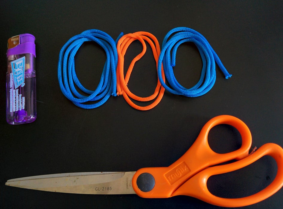 Закройте узел на каждом из концов паракордового пучка, аккуратно обрежьте и опалите концы шнурков по бокам, но оставьте нетронутым шнурок посередине.