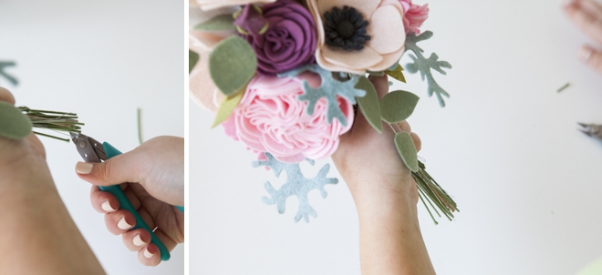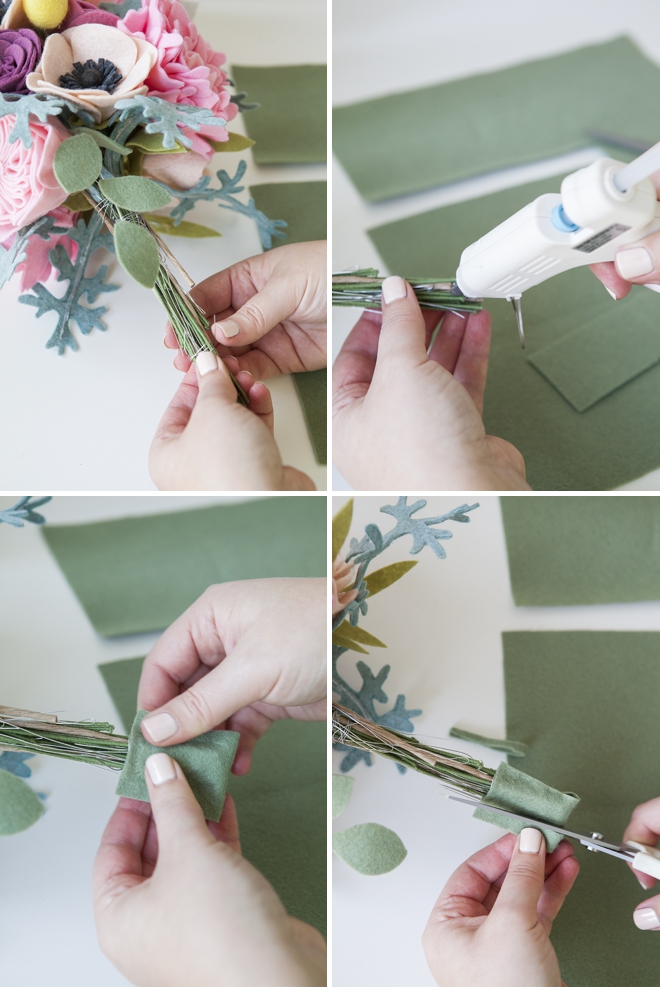 Теперь заверните в большой кусок войлока длинные стебли и закрепите его горячим клеем.