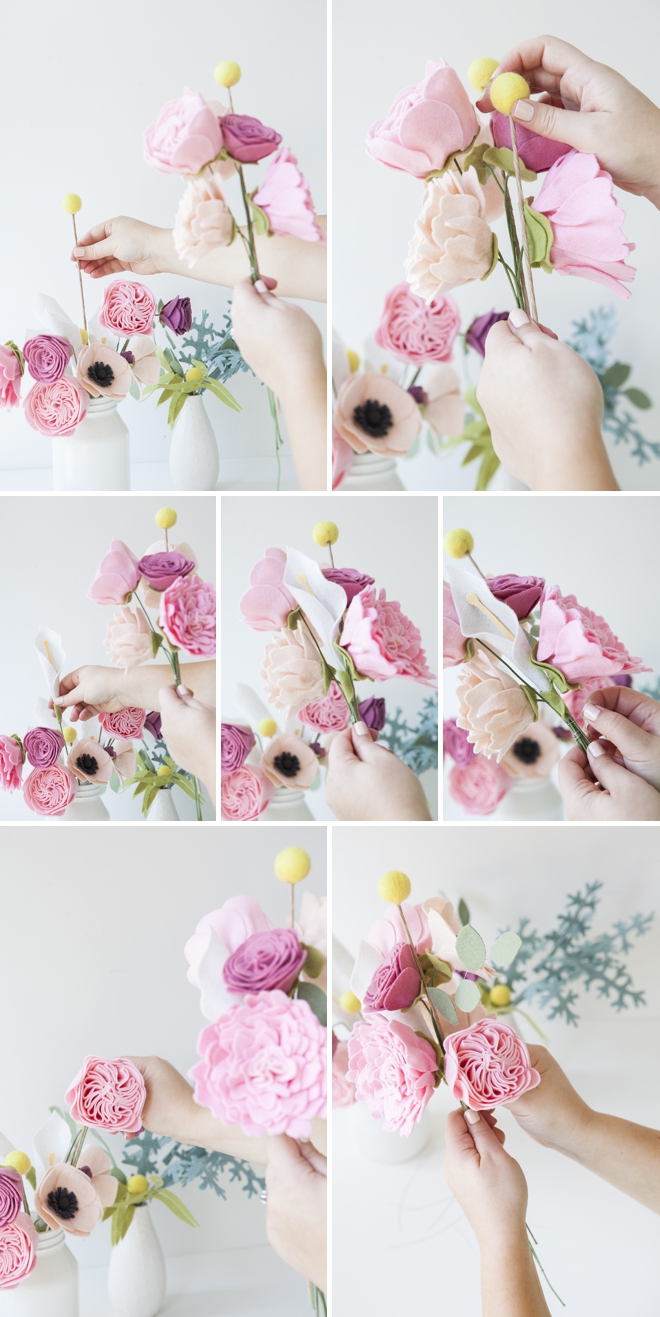 Фетровые цветы (мы выбрали пион, каллу, пыльная мельница, розу, листья эвкалипта, анемон, лютик и шарики Билли)