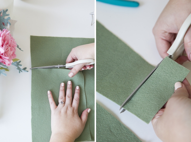 Теперь пришло время обернуть стебли букета в фетр. Отрежьте большой кусок фетра для обертывания длинных проводов и маленький кусок для обертывания их концов (см. фото).
