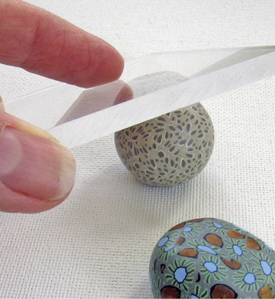 2. При помощи тканевого лезвия нарежьте глиняные «колбаски» на тонкие ломтики. Приложите полученные ломтики так, чтобы покрыть сырые глиняные шарики (см. фото B), создавая пары по рисунку и размеру.