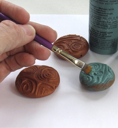 2. Раскрасьте фактурные бусины акриловой краской (см. фото F). Для имитации медной патины мы использовали зеленую краску.