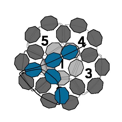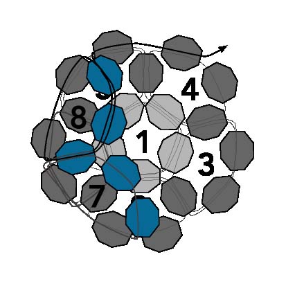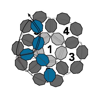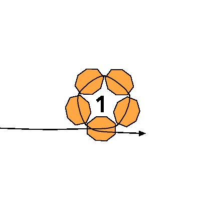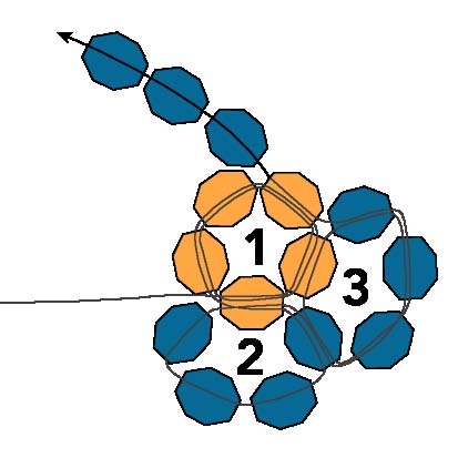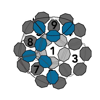 23. Первые шесть петель создают форму чашки с первой петлей внизу. Эти шесть петель показаны на схеме серым цветом и расположены за развивающимися рядами на диаграмме. Шесть петель создают первую половину круглого фуллерена, а следующие пять петель создадут вторую половину фуллерена, отклоняясь назад в противоположном направлении и образуя сферу.