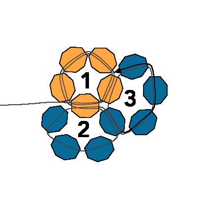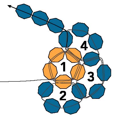 33. Пройдите через последнюю бисеринку пятого круга, вторую из четвертого и первый, нанизанный на шаге 31.