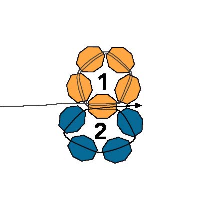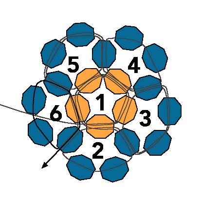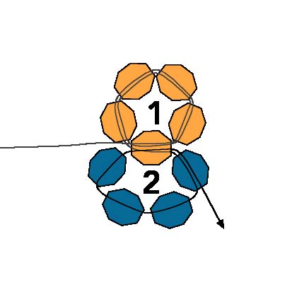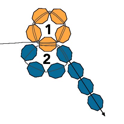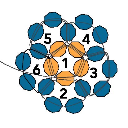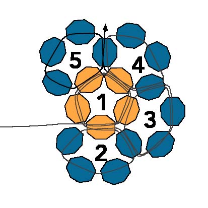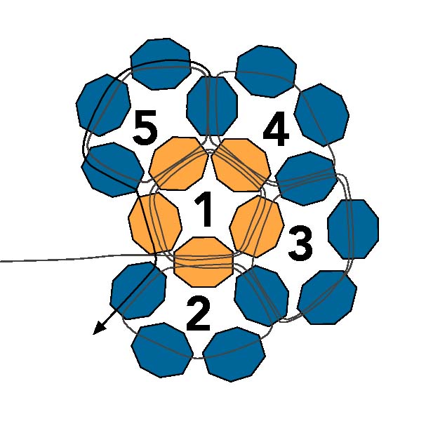 2. После этого протяните иглу через первую бисеринку, создавая круг из пяти бусинок (ориентируйтесь на схему).