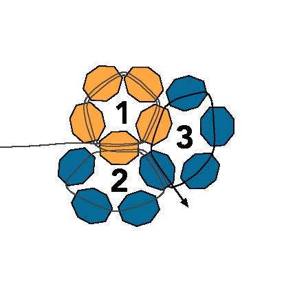 35. Пройдите через первую бисеринку, нанизанную на шаге 31, первую и последнюю бусинки шага 3 и третью из четвертого круга.