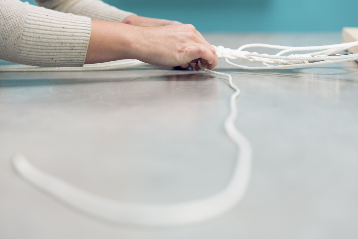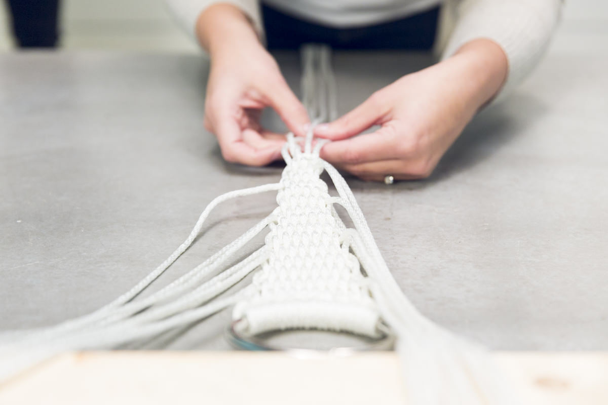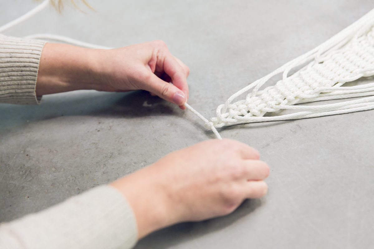 Чтобы соединить все детали, проденьте каждый шнур узла последовательно через отверстия в рамке, а затем через люверсы и завяжите соседние шнуры на узлы на изнаночной стороне гамака. Если хотите укрепить квадратный узел, поместите немного супер-клея в центр узла, чтобы зафиксировать его. Начинайте завязывать узлы, начиная с двух самых средних шнуров, затем переместитесь к самым крайним с обеих сторон. Идея состоит в том, чтобы иметь в качестве эталона три основных узла для создания одинакового натяжения шнуров.