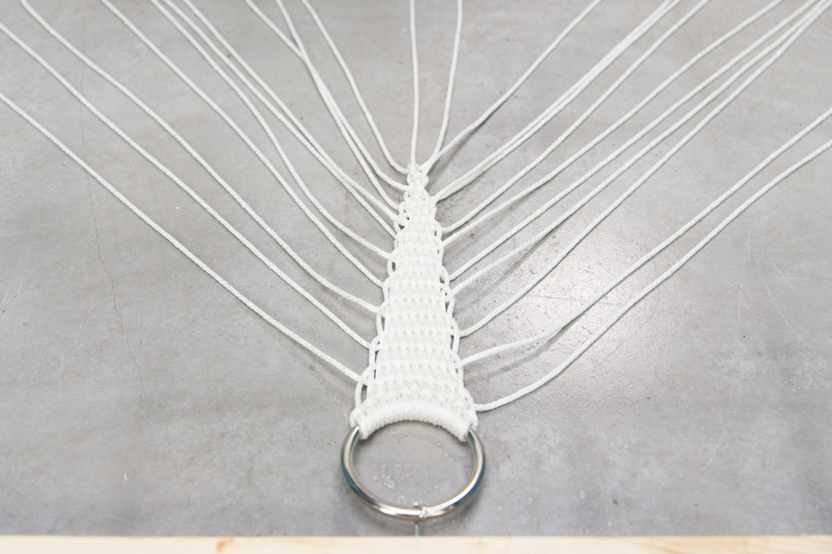 Далее сделаем V-образное плетение, которое соединит раму гамака с подставкой.