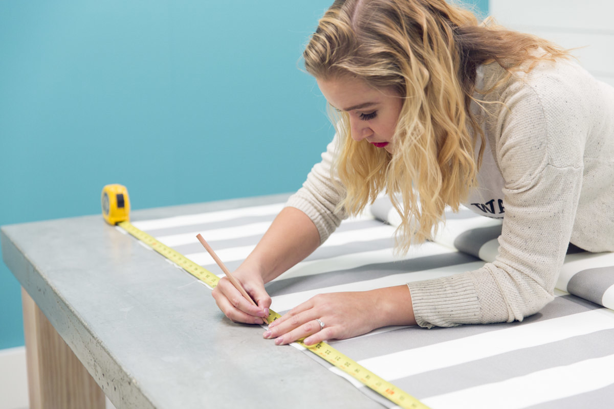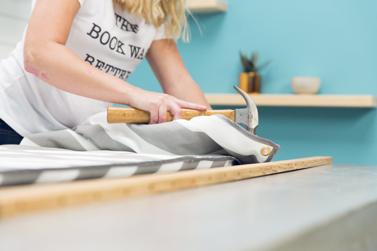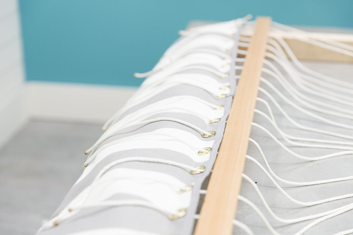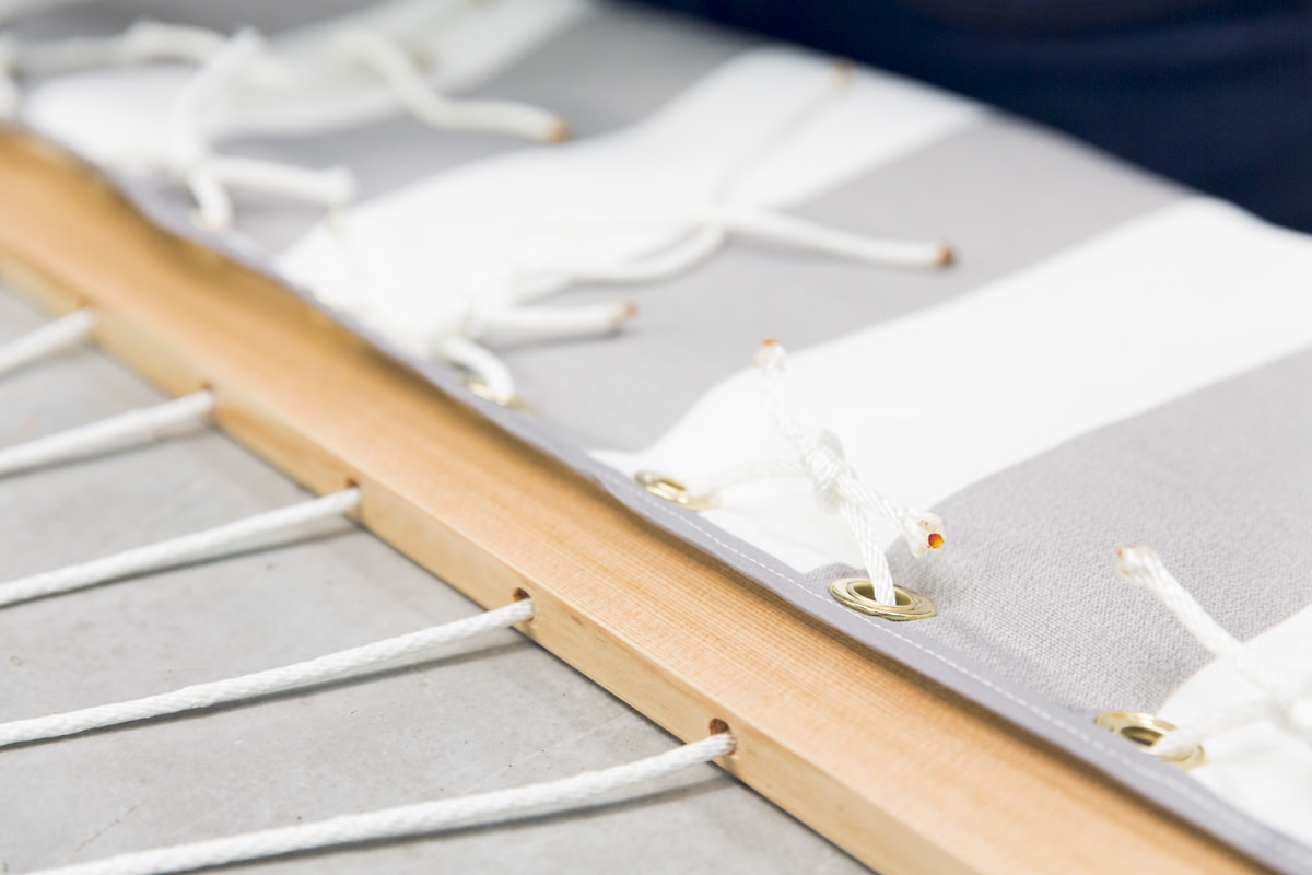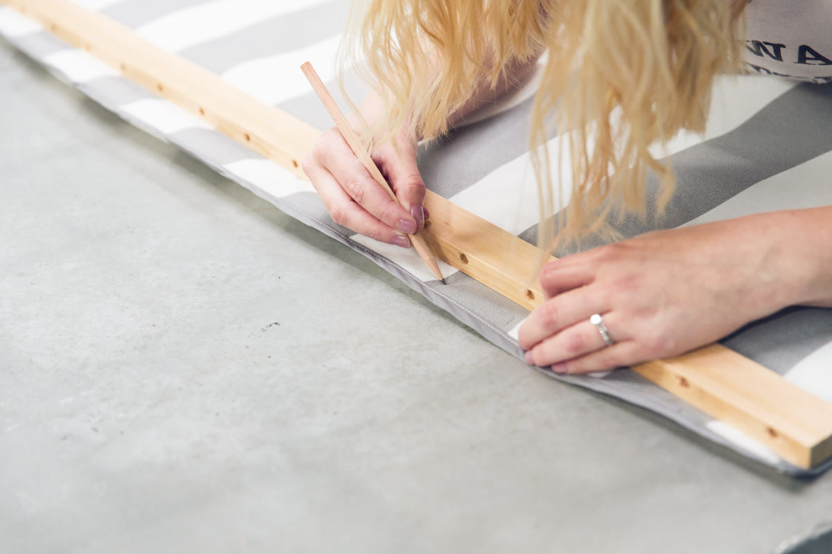 Чтобы соединить кровать с деревянной рамой, мы используем люверсы. Отцентрируйте распределительную планку по краю ткани и отметьте все отверстия на ткани - всего их должно быть 22.