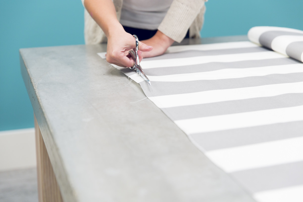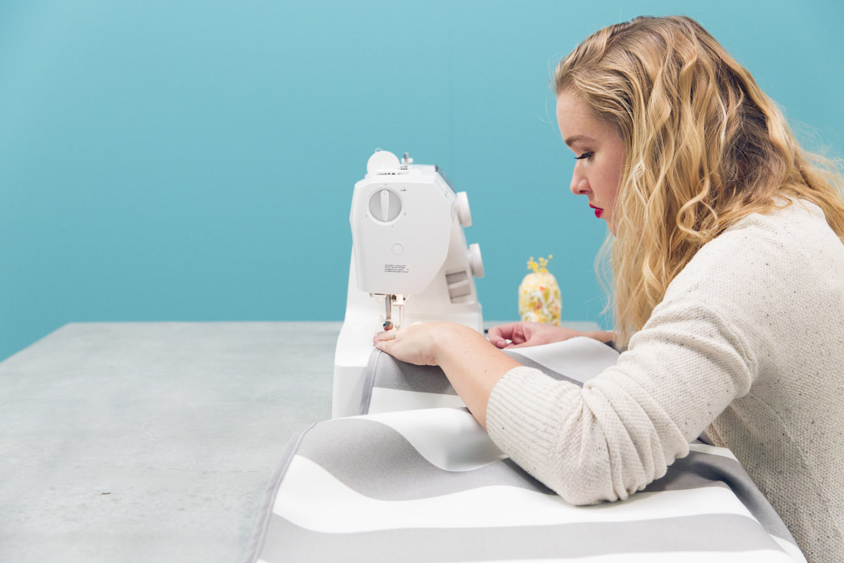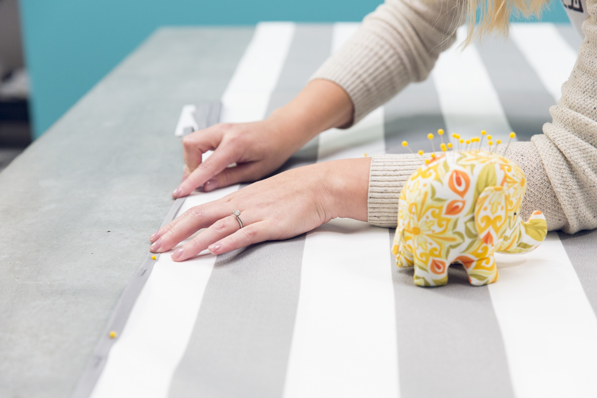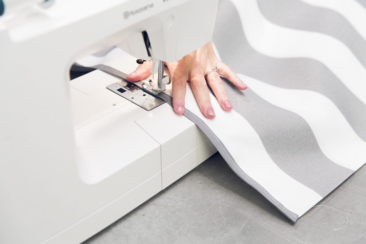 Вместо того, чтобы подшивать края, используйте кромочную ленту. (Если у вашего полотна ширина больше 1,4 м, можно просто подвернуть ее края и прострочить.)