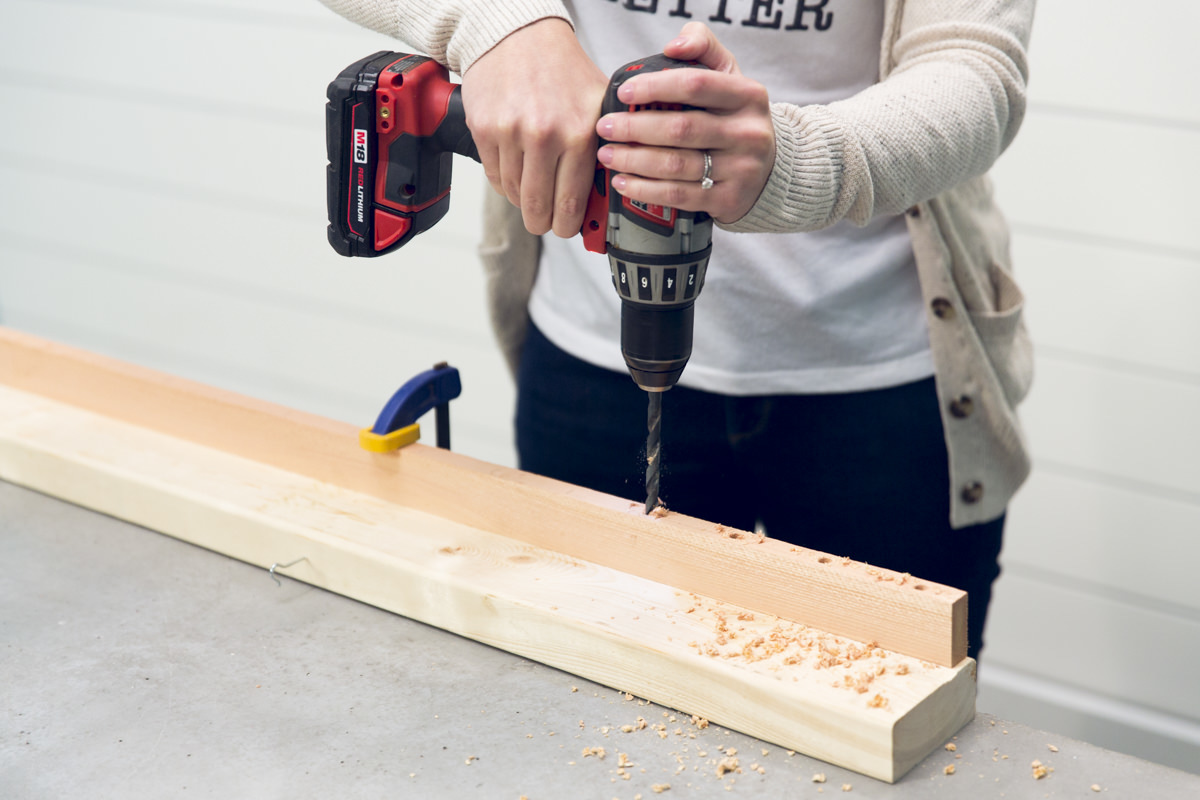 Зафиксируйте планку, а затем просверлите отверстия по меткам. Убедитесь, что вы сверлите прямо вверх и вниз, чтобы не пробивать борта. Отшлифуйте отверстия наждачной бумагой, а затем обработайте их лаком, обеспечив внутреннее покрытие каждого отверстия.