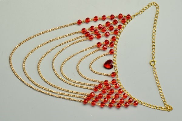 Шаг 4: завершение колье из цепочек и красных стеклянных бусин