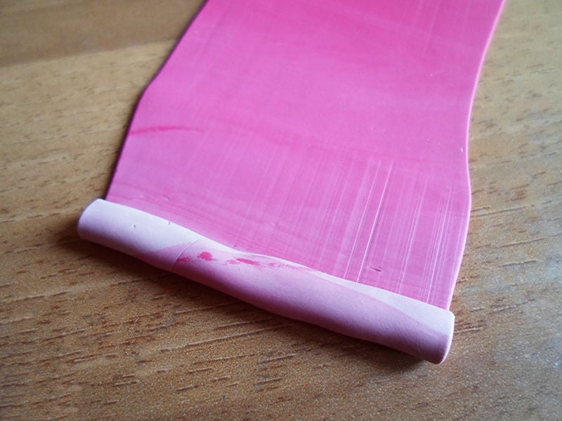 Теперь скатайте прямоугольник в рулетик, начиная с белой стороны, пока не дойдете до другого края (красного цвета).