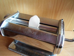 Пропустите новый прямоугольник через макаронную машину один раз, затем сложите его пополам и снова пропустите через макаронную машину.