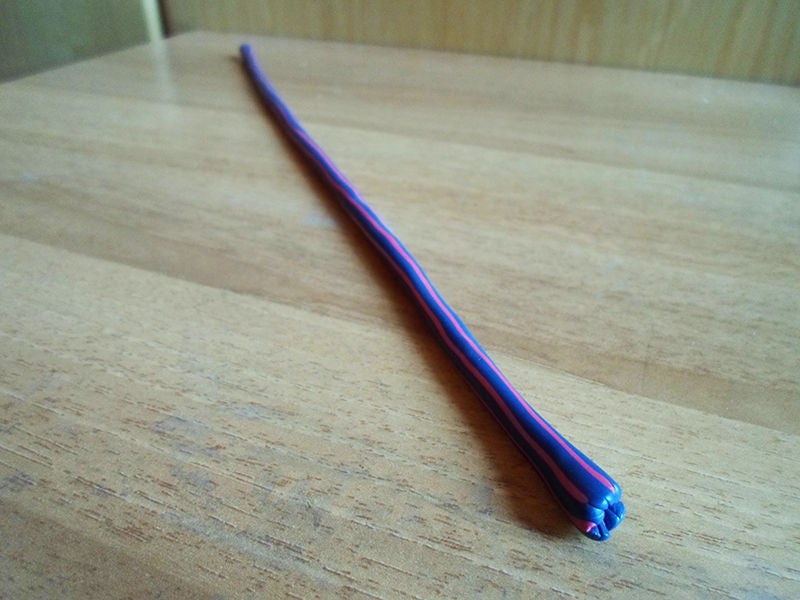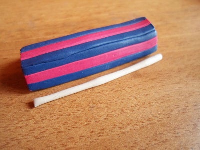 Теперь возьмите маленький кусочек белой глины и сделайте из него очень тонкую колбаску -толщиной около 1 мм и такой же длины, как сине-красные колбаски.