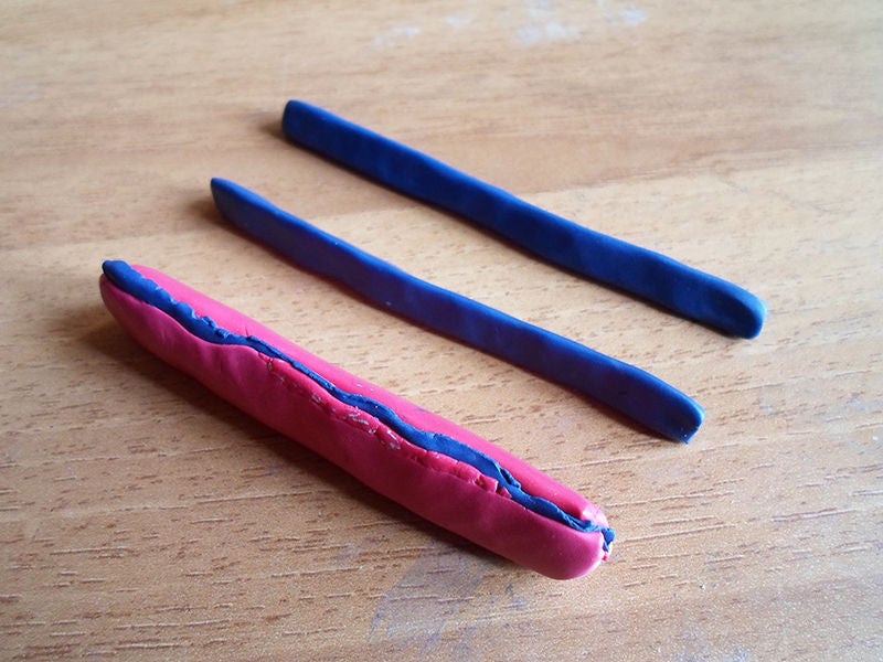 Возьмите еще один кусок голубой глины и сделайте из них 2 тонких колбаски такой же длины, как красно-белая.