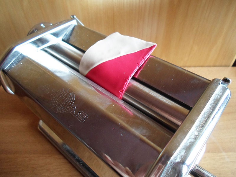 Продолжайте складывать пополам каждый получившийся прямоугольник после прохождения через макаронную машину много раз (возможно, потребуется даже около 20 раз), пока оба цвета не смешаются вместе и не получится оттенок от белого до темно-красного.