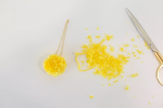 Используя ножницы, произведите небольшую стрижку. Срежьте лишнюю длину нитей с разных сторон изделия, чтобы получить красивую и ровную круглую форму, как показано на фото.