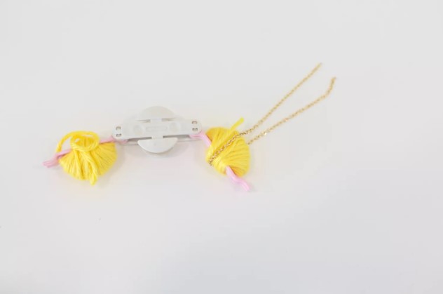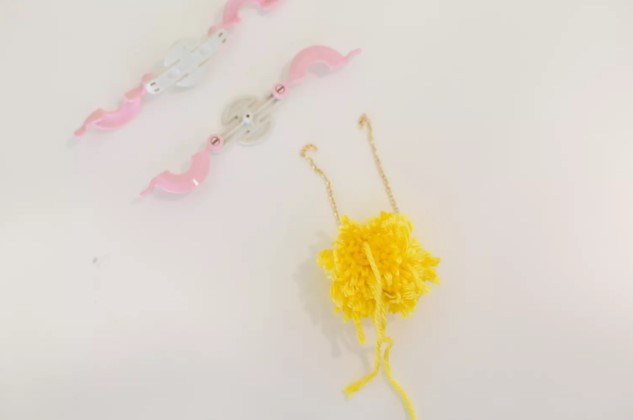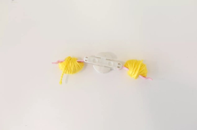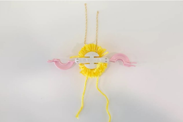 Раздвиньте половинки механизма при раскрытых планках. Это высвободит помпон с цепочкой, проходящей сквозь него, связанные длинной нитью.