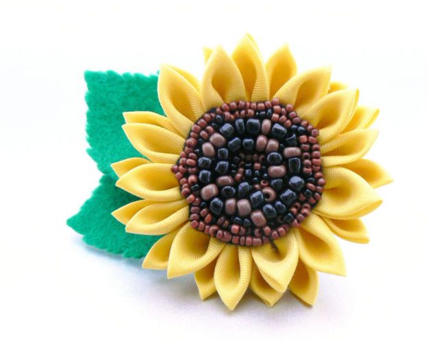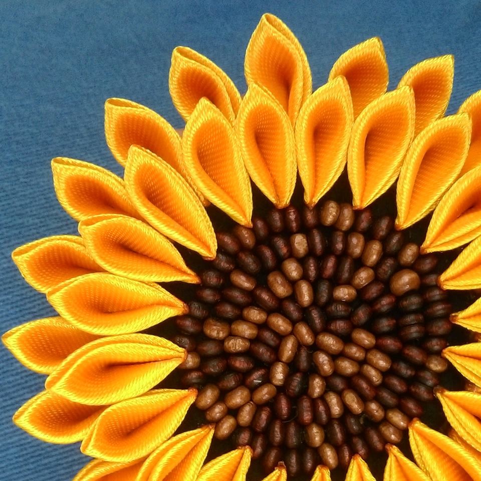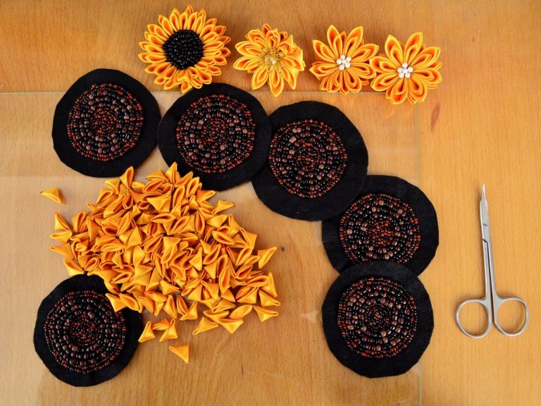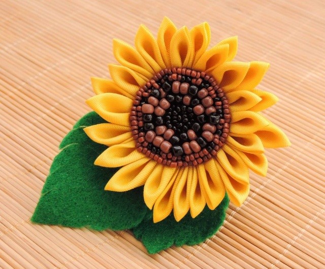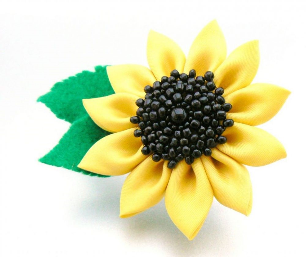 Если вам нужно создать оригинальное яркое украшение для волос из атласных лент, а также если у вас осталось много черных и коричневых бисеринок из ваших предыдущих экспериментов, и вы не знаете, что с ними делать, то вам обязательно нужно ознакомиться с нашим сегодняшним мастер-классом. Чтобы сделать этот очаровательный подсолнух, вам нужно обладать навыками техники цумами канзаши, а также еще добавить кое-что.