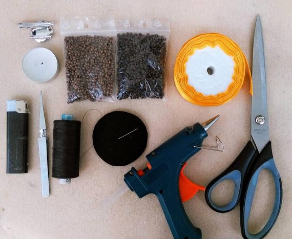 фетр для черного круга, на который будем пришивать бисер, и еще один для скрытия задней части работы, а также зеленый кусочек для листьев - по желанию;