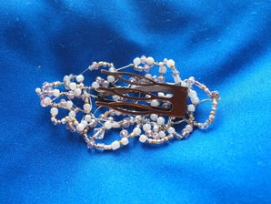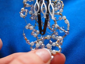 Таким образом, мы приложили бисероплетение к основе и определились с его расположением на ней. Затем мы отрезали провод, чтобы прикрепить один его конец с изнаночной стороны, а другой туго натянули и прикрепили к бусинке, чтобы спрятать проволочный конец. Этот прием позволяет сделать аккуратный внешний вид изделия, а места крепления - незаметными. На заостренном конце нашей основы для заколки имелось отверстие, и мы использовали его, чтобы протянуть через него провод и прикрепить его рядом с отверстием. Также мы прикрепили бисерную часть с другой стороны основы заколки.
