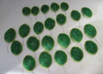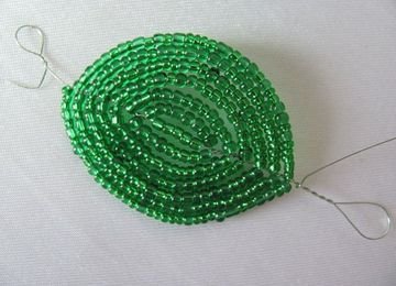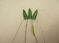 5. В каждом следующем ряду добавляйте по несколько бисерин, пока не сформируете листик. Чтобы получить лист нужной формы и размера, следует набрать 13 рядов зеленым 2 ряда светло-зеленым бисером.