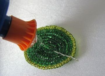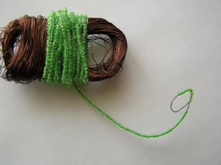 1. Нанижите на проволоку побольше зеленого бисера. Отделите 8 бисеринок и, минуя первые 4, проденьте проволоку в следующие 4 из этих 8-ми. Оставьте торчащим конец проволоки длиной около 1,5 см, а на другом краю от образовавшейся петельки оставьте кончик длиной 4 см, отрезав остальную проволоку. Сформируйте из петельки овал.