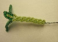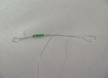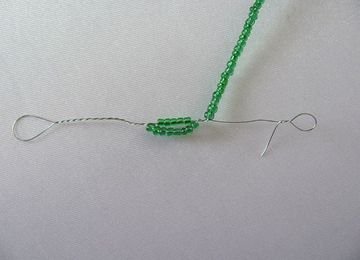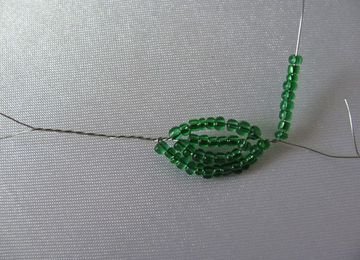 2. Затем нанижите на него еще 8 зеленых бисеринок и закрутите проволоку над первой бисериной, надетой в предыдущей строчке.