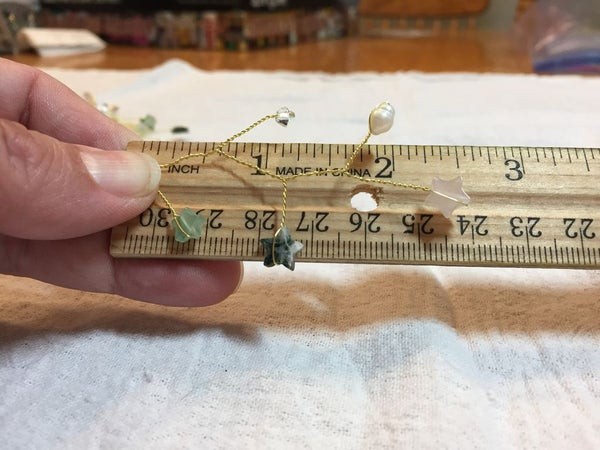 6. Наденьте другую бусину на провод. (После 1-й бусины в форме звезды мы нанизывали следующие камни в произвольной последовательности.) Удерживая бусинку на изгибе, туго скручивайте 2 конца провода, пока не вернетесь к центральной ветке.