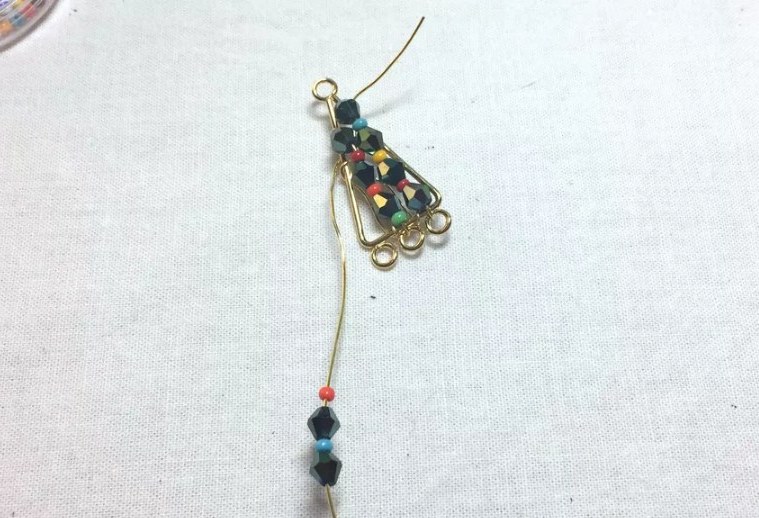 5. Прикрепите второй ряд бусин. Подберите бусы для следующего ряда и нанижите их на проволоку. В нашем случае в первом ряду четыре кристаллических биконических бусинки, во втором - три, а в третьем - две. Бисеринки находятся чередуются с каждым кристаллическим биконусом, добавляя некоторую динамику с помощью контрастного цвета и помогая ровно расположить стеклянные бусинки (см. фото).